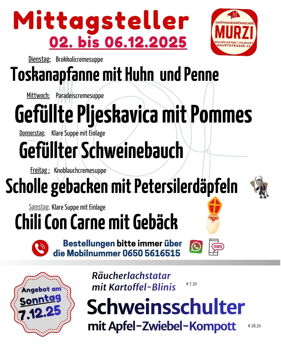 Von Dienstag bis Samstag servieren wir in der Zeit von 11 - 13:30 Uhr unsere beliebten Mittagsteller by Murzi. Seit Kurzem gibt es jeden Sonntag ein spezielles "Rund-um-Angebot". Dies finden Sie ebenfalls auf dieser Seite!